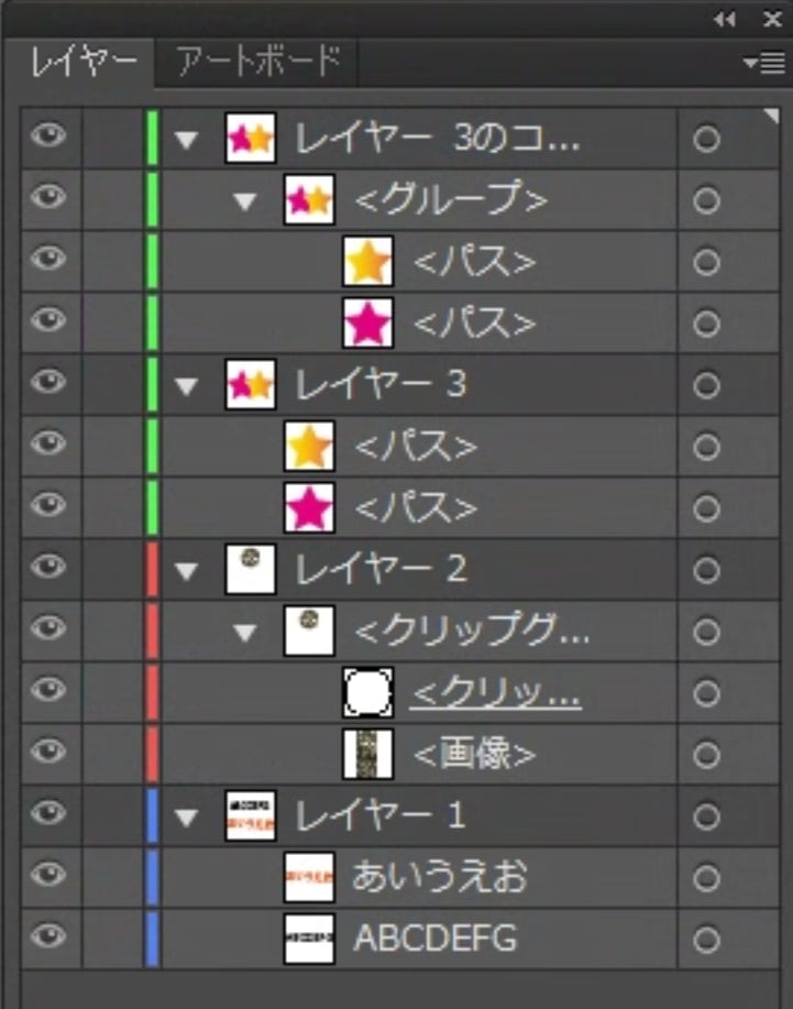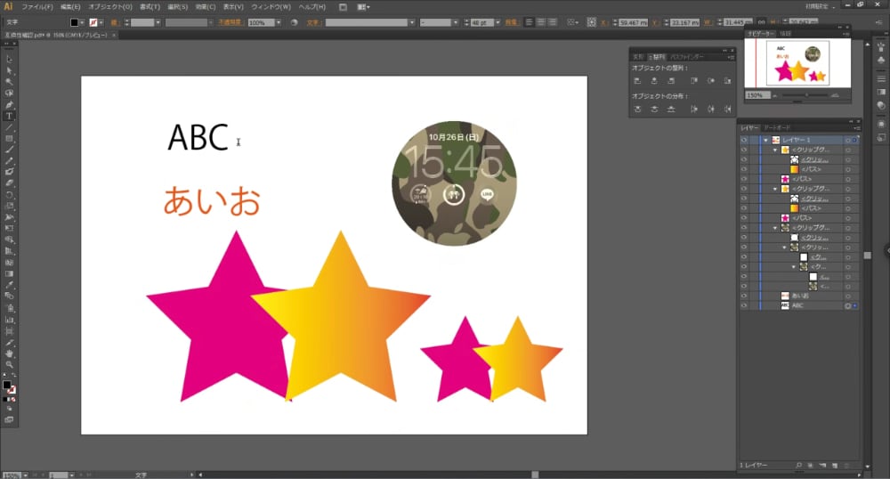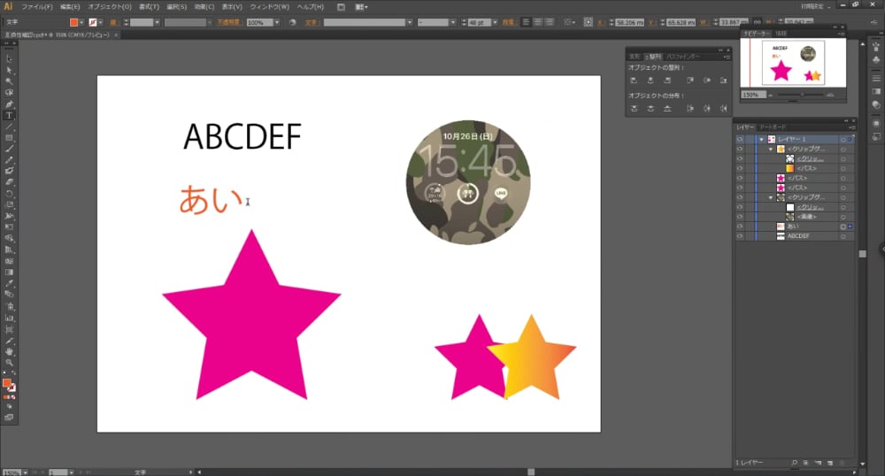 テキストデータにパスとグループ化したパス、さらに画像にクリッピングマスクを適用したファイルを用意しました。