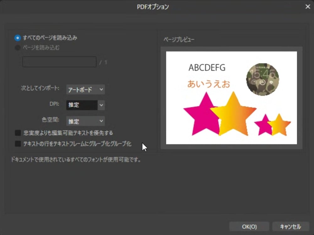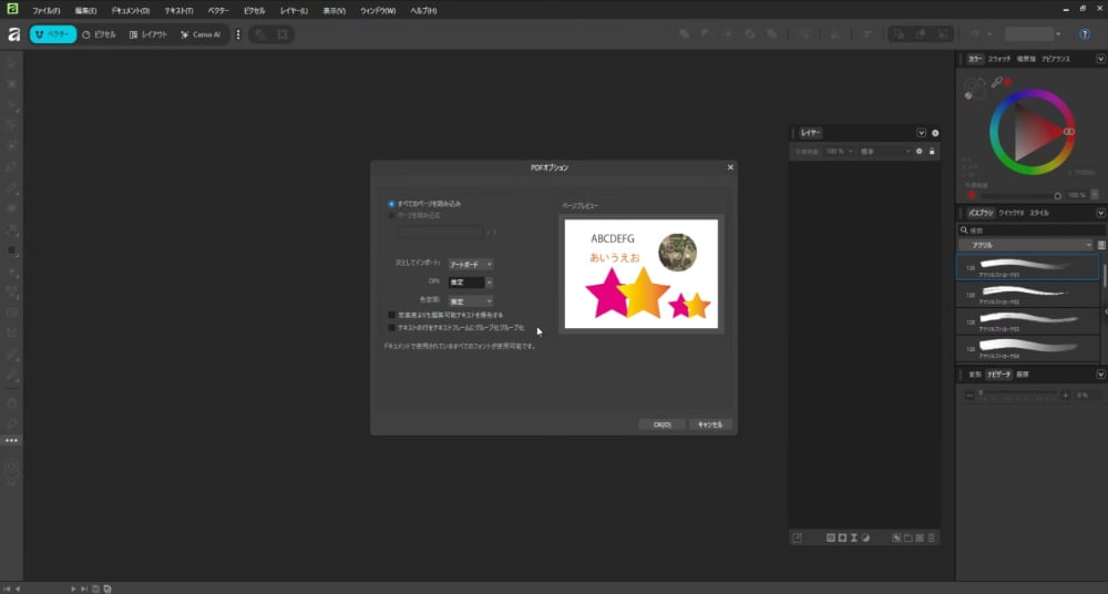 Affinityが立ち上がり『PDFオプション』といった画面が出て来ました。