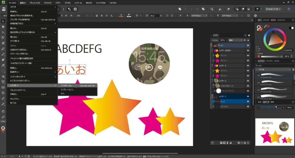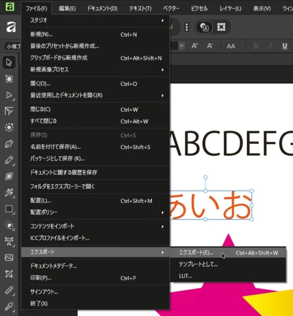 ファイルメニューからエクスポートを選び