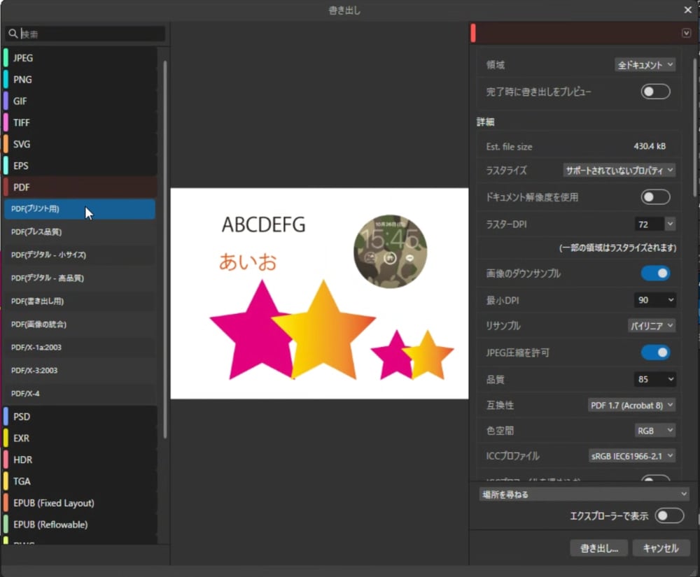 PDF(プリント用)では『ラスターDPI』の数値が72でした