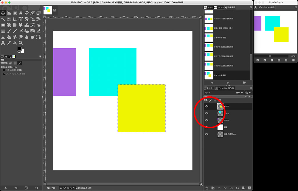 例ではパープルとブルーとイエローの素材が別々のレイヤーとして配置されています。